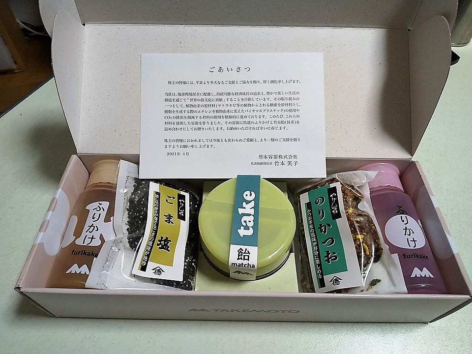 | 優待内容 | (1)自社指定商品(健康食品) (2)自社指定商品割引販売オンラインカタログ ・100株以上 (1)1品および(2) ・500株以上 (1)2品および(2) |